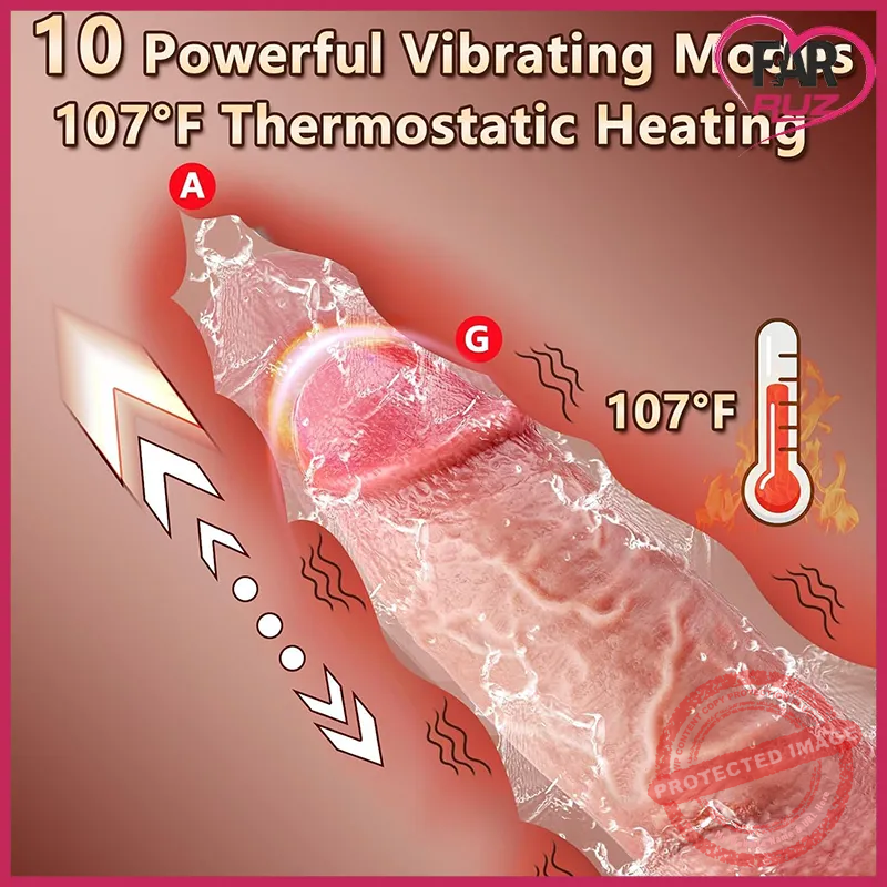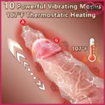 10 titreşim ve 10 itme modu dakikada 700 itmeye kadar çıkar; 107°F (≈42°C) ısıtma özelliği gerçekçi bir sıcaklık hissi oluşturur.