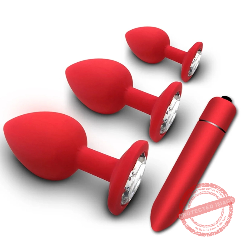 Set içeriği: S, M, L boy silikon diamond anal plug + kırmızı vibratör